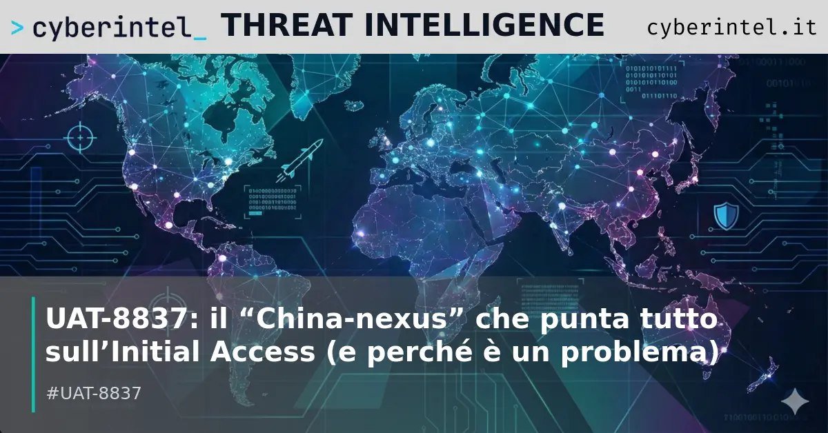 Cisco Talos sta monitorando UAT-8837, un cluster di attività valutato con “medium confidence” come riconducibile all’ecosistema China-nexus APT, con un profilo che si distingue per un obiettivo molto preciso: ottenere accesso iniziale a organizzazioni ad alto valore e preparare il terreno per intrusioni più profonde. Il punto chiave non è solo chi colpisce, ma come lo fa: l’operazione sembra costruita per aprire porte, creare canali di rientro e mappare l’ambiente con rapidità, sfruttando una combinazione di exploit server-side e credenziali compromesse, spesso con tooling open-source e tecniche già “collaudate” in campagne affini.